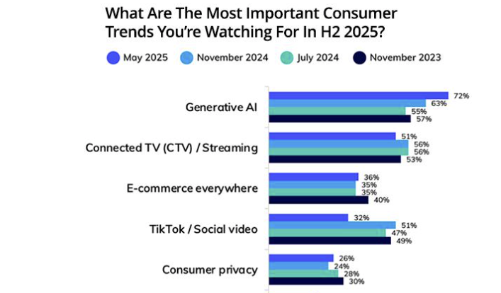Generative AI and CTV emerge as top priorities according to the Mediaocean 2025 H2 Market Report.